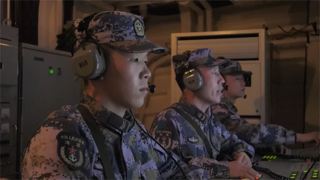 面对水下来袭目标,上舰刚满9个月的大学生士兵许康作为主要号手第一次实射火箭深弹,按照训练章程冷静操作,成功发射。