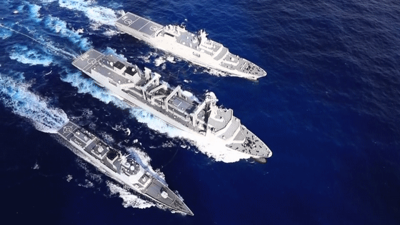 大洋深处航行,补给很重要,编队还进行了战时补给演练。