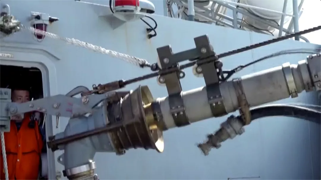 在银川舰前甲板作业区,操作手根据查干湖舰发射的引缆架起承载索对接输油管线,进行油料补给。