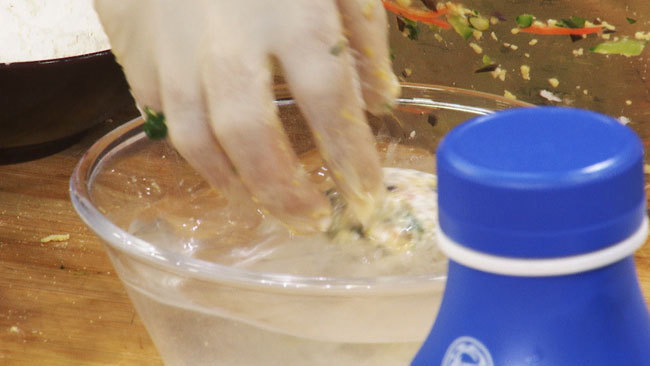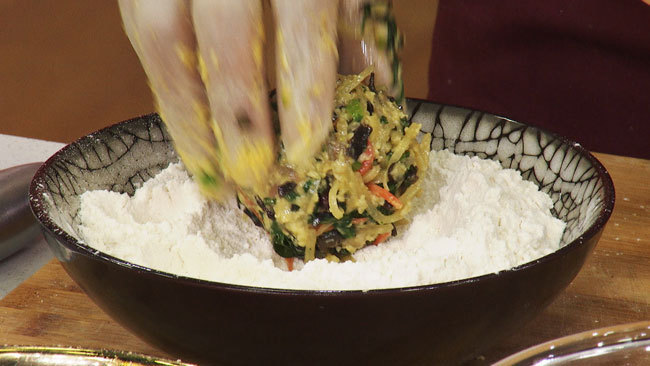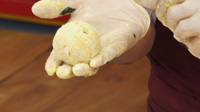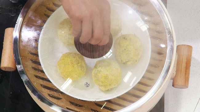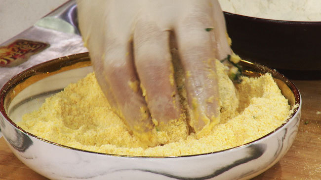 步骤2:将食材揉成团,按压紧实,裹一遍白面后,过一遍清水,再放入玉米面中裹匀;