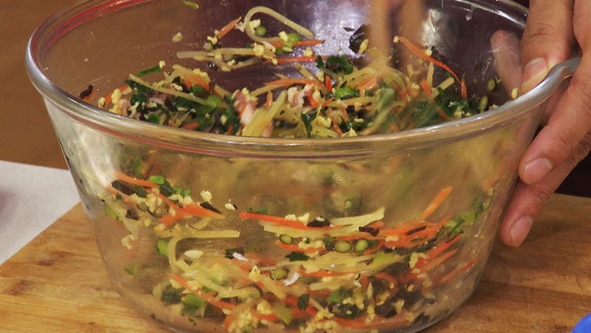 步骤1:土豆和胡萝卜切丝,小白菜、红菜苔和木耳切碎,几种食材和鸡蛋还有肉馅搅拌均匀,放入蚝油和五香粉调味;