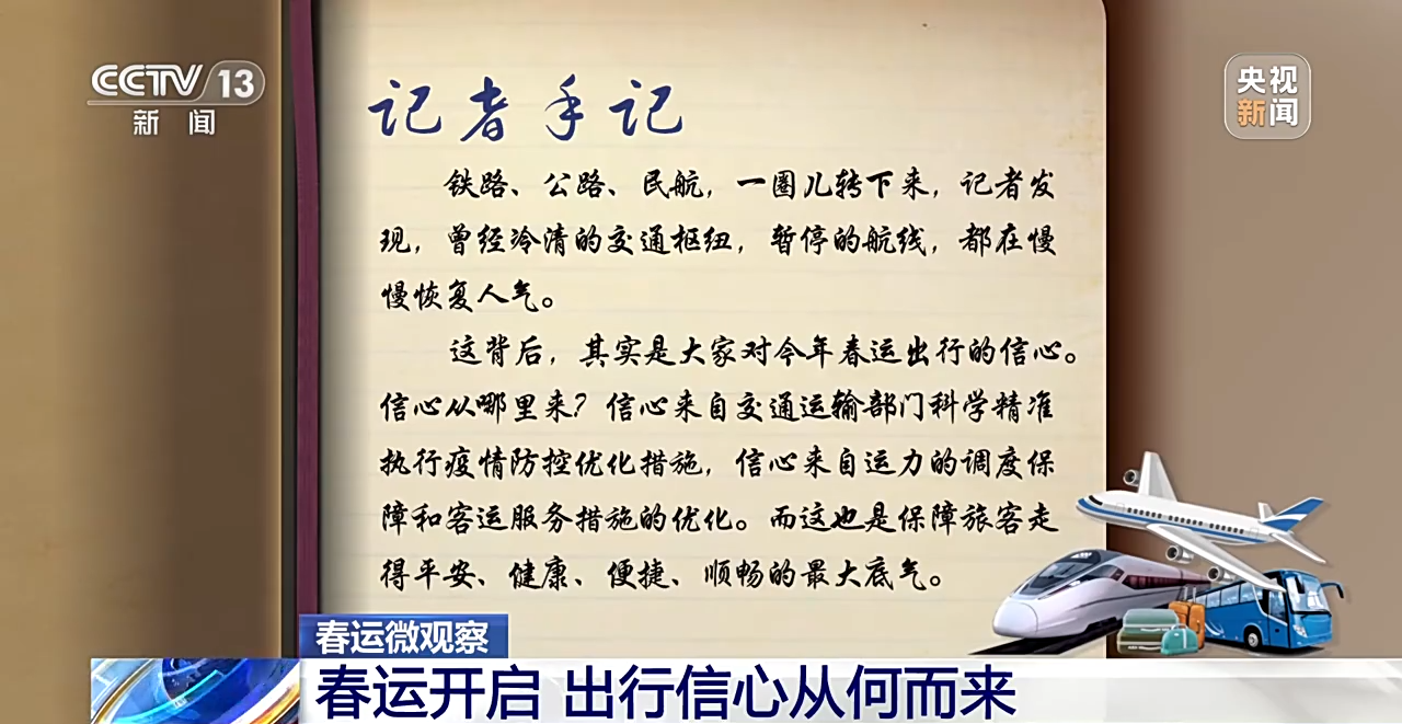 铁路、公路、民航,一圈儿转下来,记者发现,曾经冷清的交通枢纽、暂停的航线,都在慢慢恢复人气。这背后,其实是大家对今年春运出行的信心。信心从哪里来?信心来自交通运输部门科学精准执行疫情防控优化措施,信心来自运力的调度保障和客运服务措施的优化。而这也是保障旅客走得平安、健康、便捷、顺畅的最大底气。