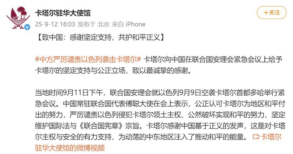 9月12日,@卡塔尔驻华大使馆发布题为“致中国:感谢坚定支持,共护和平正义”帖文。