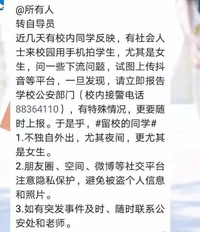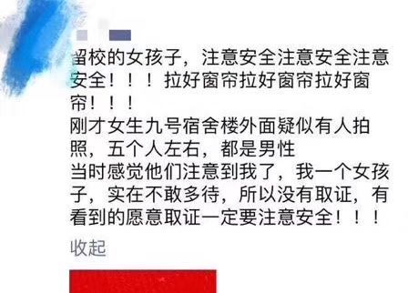 不仅如此,还有在校女生发帖称,最近在女生宿舍楼有频繁看到非校园人士的陌生男性在拍照,并提醒学校女生拉好窗帘。