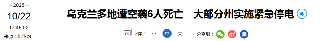 乌克兰能源部当天在社交媒体发文称,由于乌能源基础设施遭大规模无人机和导弹袭击,乌大部分州实施紧急停电,电力恢复工作正在进行中。