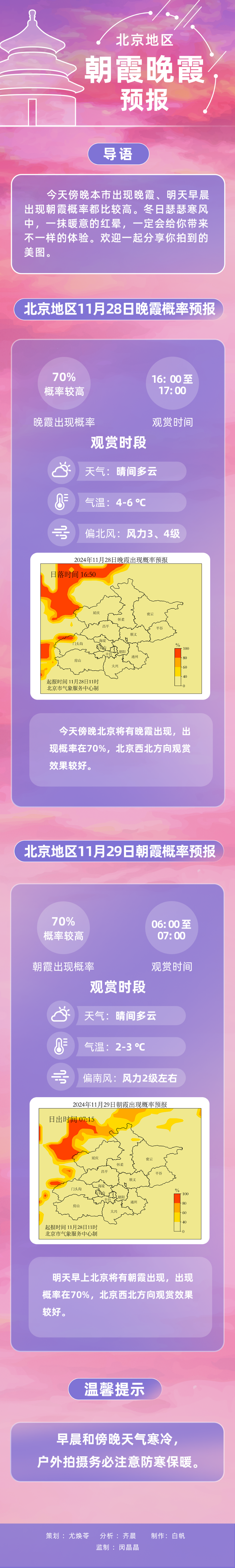 不过需要注意,今天傍晚和明天早晨天气寒冷,户外拍摄要注意防寒保暖。