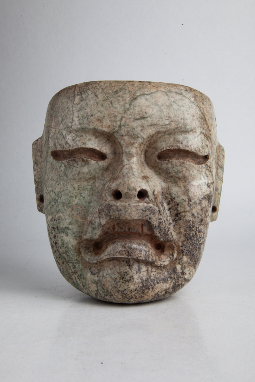 这件奥尔梅克文化石面具表现了肥厚且向下弯曲的嘴唇,呈现出U字形造型,使人联想到美洲豹的面部特征,因此被称为“豹人”。面具主要有三类用途:一是用于舞蹈表演、仪式活动或战争场景;二是粘贴在陶器或建筑构件上,将神灵形象拟人化;三是用作丧葬面具。