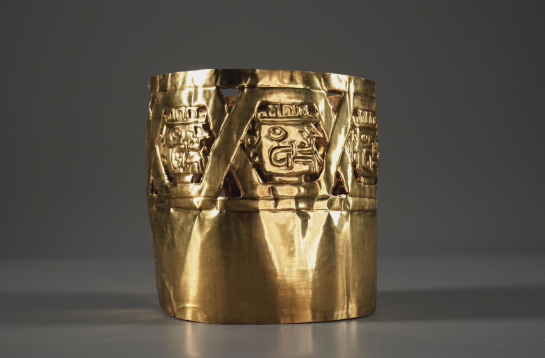 这件库比斯尼克文化晚期的金冠,出土于萨尔潘(Zarpán)遗址,由一片矩形金片弯曲成圆柱形。中间浮雕带表现了6个侧面的人像,其中3个向右,3个向左,偏向上方的瞳孔、外露獠牙等方面体现了猫科动物特征的融合。猫科动物是库比斯尼克文化图腾的核心元素,象征力量与宇宙秩序。这个侧面形象展现了祭司在产生幻觉后,实现人神转换仪式、获得超自然力量的过程。在社会等级分化的早期,金器是新兴统治阶层实现权力正当化的关键媒介。