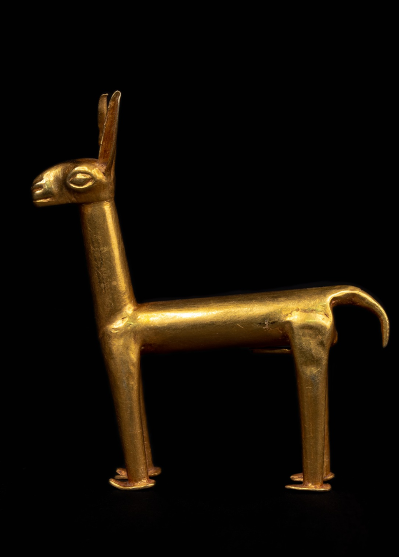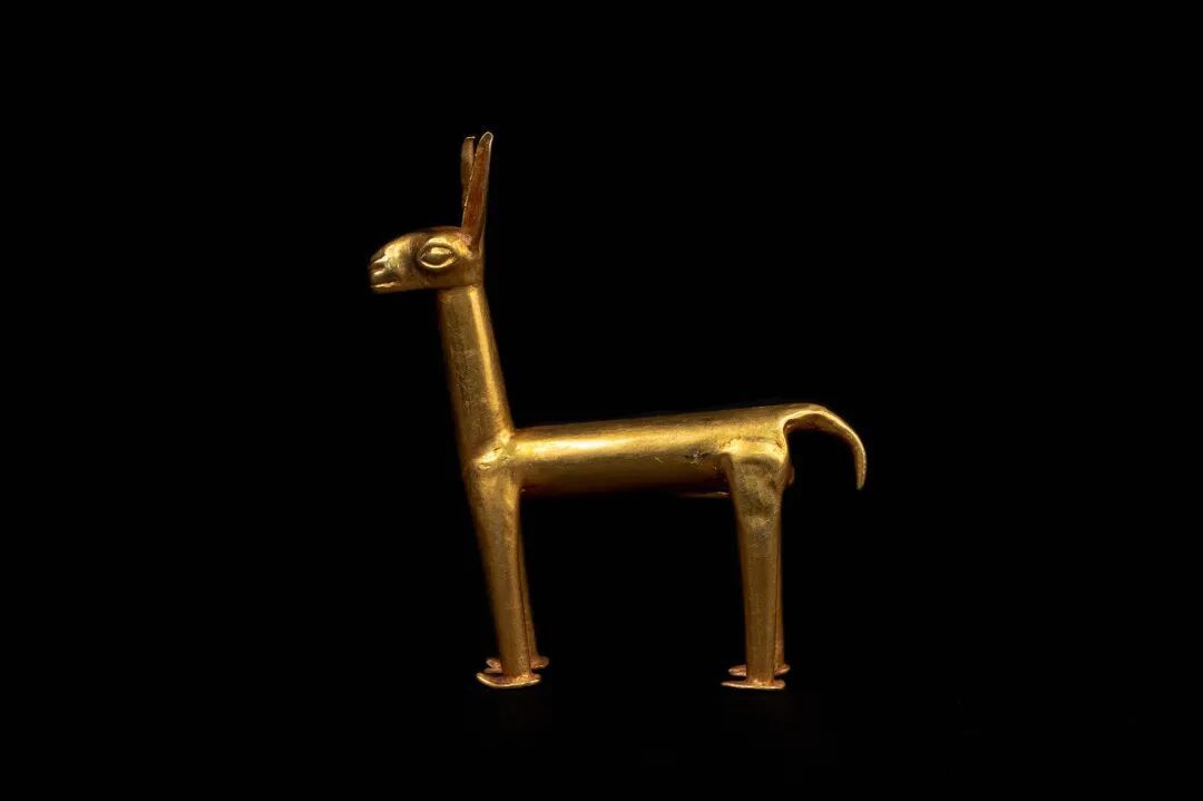 这件金羊驼造型简洁凝练,由多片黄金塑形后组合并焊接而成。羊驼是高海拔地区毛料来源和驮运的重要畜力,畜群的规模直接影响着地区的财富与繁荣。因此,此类雕像常用于祈求牧业兴旺的祭祀仪式中,它们被视为拥有力量、活力与灵魂的神像,可以沟通神圣力量,维系宇宙秩序。