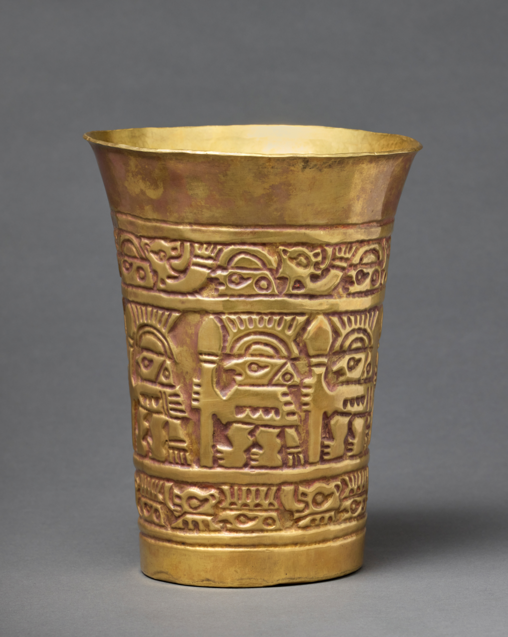 金杯外壁分3层饰带,主要图案为丹凤眼的西坎主神执杖形成行进的队伍。金杯是西坎文化中祭祀和仪式上使用的具有标志性的器物。由于它的形状与南部高地的蒂亚瓦那科文化和瓦里文化的“凯罗”很相似,专家认为此类金杯可能是在瓦里向北扩张时期与北部沿海文化交流过程中的产物。西坎金杯主要用于盛放玉米酒(奇恰)等祭品。在墓葬中,此类金杯为贵族的随葬品,有时被墓主人握在手中,预示着他在通往来世的途中可与神灵、祖先共饮,体现了现世权力与祖先世界之间的连续性。