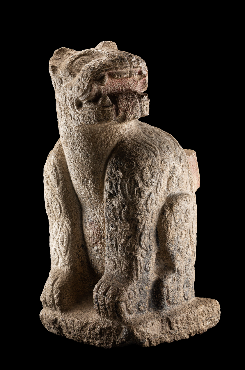 这件美洲豹形的旗座发现于奇琴伊察遗址的圣井内。玛雅人认为,美洲豹拥有锋利的爪牙,可以撕开黑暗与水,它灼热的呼吸能催动黎明破晓,最后化作太阳,冉冉升起。这件美洲豹形旗座,背后原有用来插旗杆的石环。据专家考证,这件旗座与托尔特克人在墨西哥中部地区城市中心图拉(Tula)的同主题雕塑非常相似,明显是托尔特克文化与玛雅文化相结合的产物。