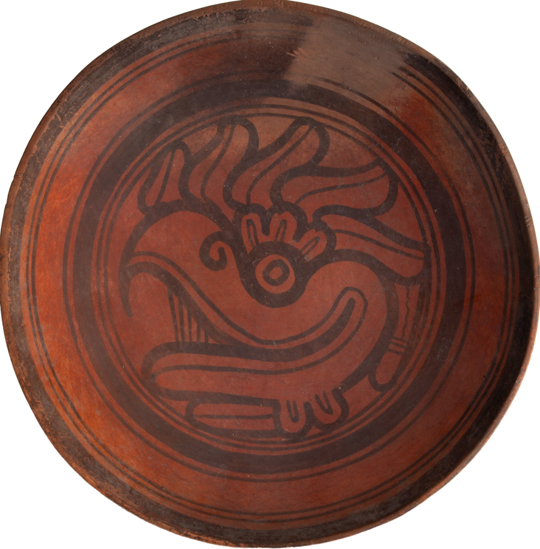 这件陶盘的内壁周围一圈饰有14只坐着的类人形态的鸟类,它们戴着砖红色的头饰,穿着红裙和白腰带,从红色小碗中啄饮。这些鸟类可能表达了玛雅祭祀中动物转化的概念,在祭司进入狂喜和恍惚状态时,常常会“体验”转变为动物的过程,这些动物很可能就是这一过程中所呈现的形象。陶盘中心有一个穿孔,属于典型的“杀孔”工艺——当器物结束实用阶段转为随葬品时,通过象征性破坏其容器功能(即“杀死”器物),实现生死界限的仪式性跨越。