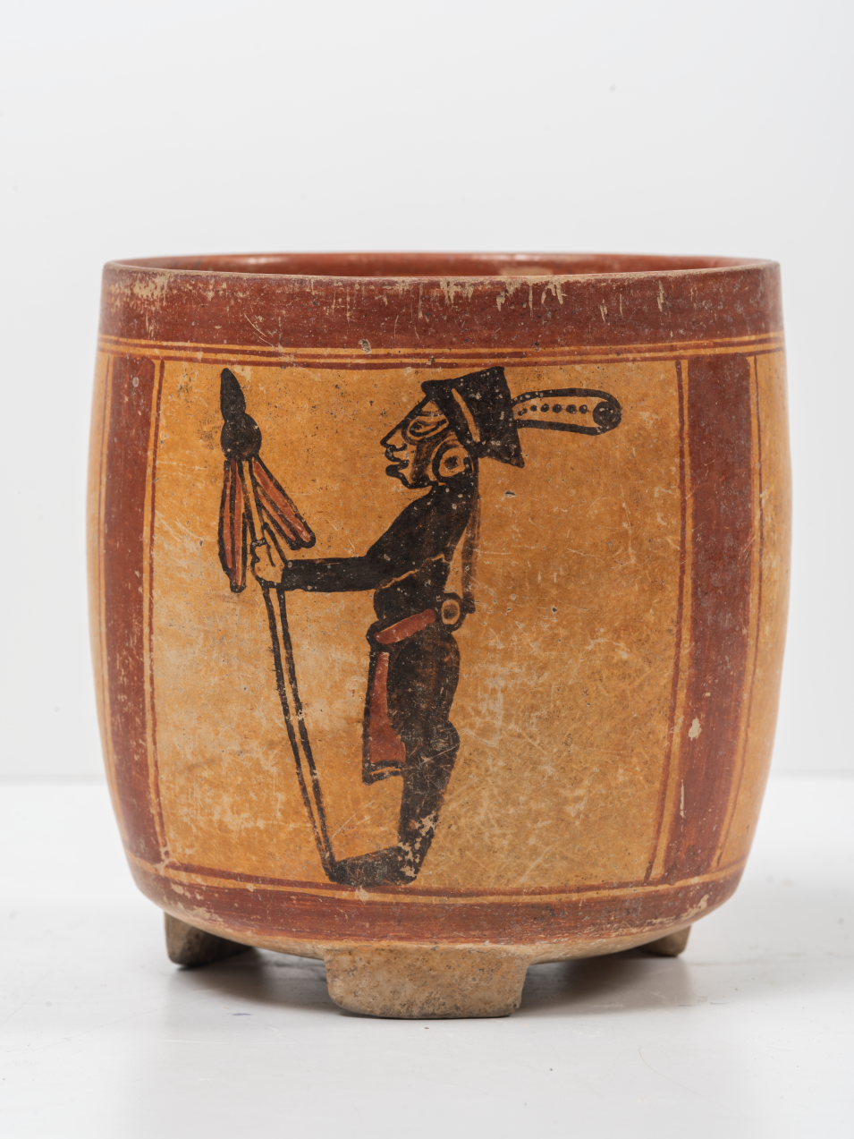 这只陶杯上画着一个商人的形象。玛雅人认为,从事长距离贸易就如穿越下界一般危险。因此,商人出差时,会将自己的皮肤涂成黑色,以模仿居住在下界的商人之神的肤色,并且全副武装,以抵御路途上的种种不测。