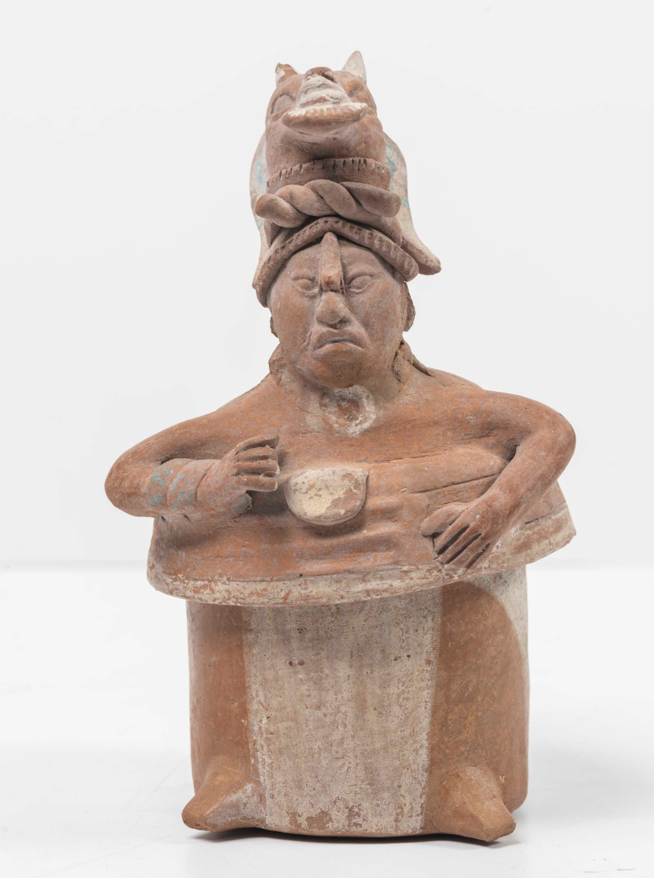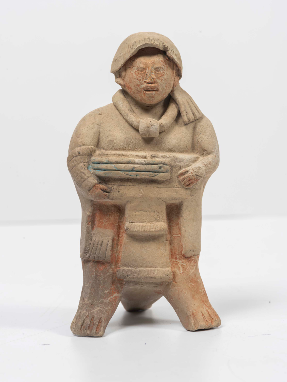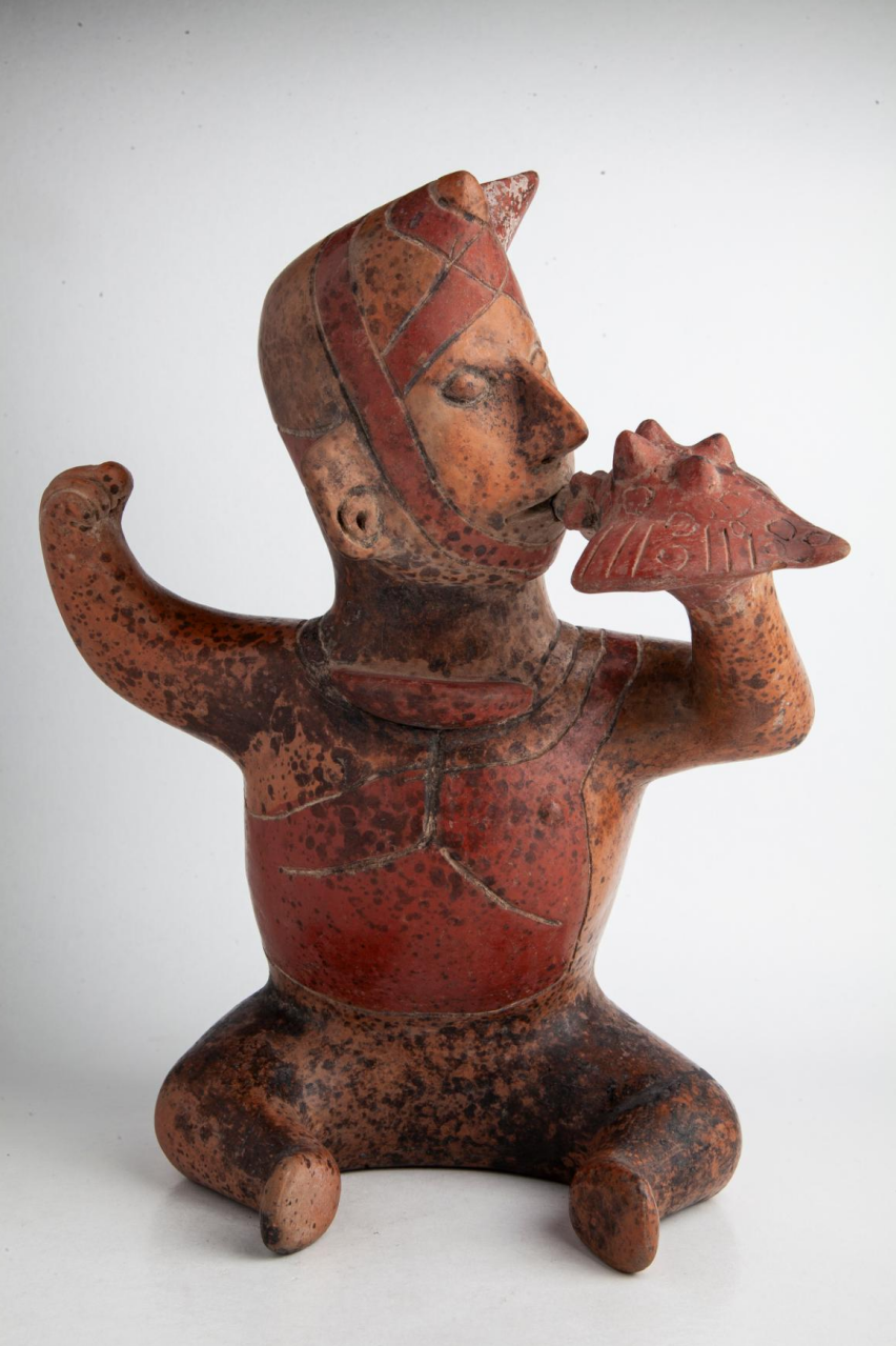 这件墨西哥西部科利马(Colima)风格的陶像表现了一位正在举行仪式的人,他双臂高举,吹奏着海螺形状的乐器。海螺乐器发出的声音被古代美洲中部地区的人视为能够与神圣世界沟通的媒介,用于在庆典开始前召唤神灵力量。