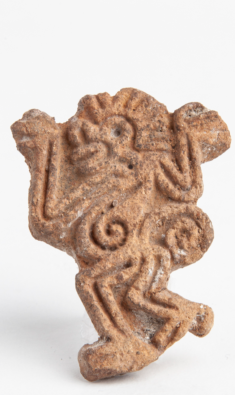 这件猴形陶印章代表着古代美洲中部典型的“印花”传统。印章在美洲中部最早可以追溯到约公元前1500年,主要用于在织物、装饰物、器物、人体和晚期出现的手抄本上印制图像。印章的图案有几何图形、动物、植物等。这件猴形印章的动物原型为中美洲特有的蜘蛛猴。