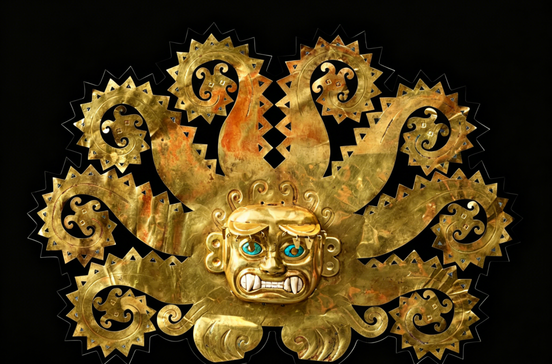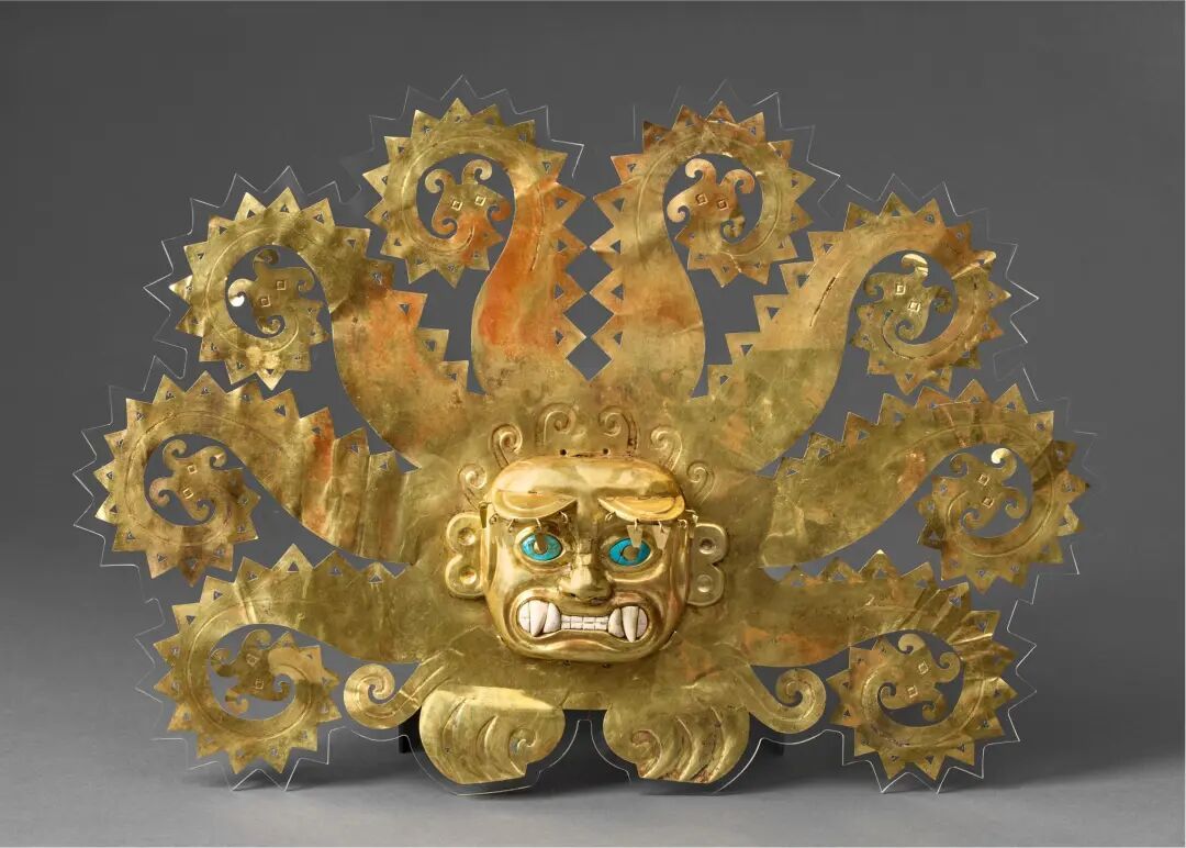 这件莫切金冠饰是安第斯冶金工艺的巅峰之作,主要分两部分:中央为具有猫科动物特征的人面,双目以凤凰石与金圆片镶嵌,眉弓突起并悬有梯形坠饰,口部以锥螺贝壳嵌出獠牙;脸部周围延伸出8条类似章鱼的触手,末端为鲇鱼形神话生物。据西潘王陵发掘者沃尔特·阿尔瓦推测,这件冠饰是1988年西潘考古区遭大规模盗掘时流失的文物,2006年由伦敦警察厅查获,经秘鲁驻英使馆、伦敦警方与国际刑警组织合作追回后,移交秘鲁国家文化研究所,现藏于秘鲁文化部国家博物馆。这件冠饰通过猫科动物与海洋元素的结合,构建出大地与水域超自然世界的关联,是莫切文化中冶金技艺与意识形态高度融合的典型代表。