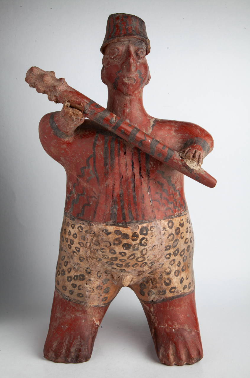 这是一件墨西哥西部风格的红土陶人形小雕像,其面部、躯干和上臂均有瘢痕(即纹身),头戴圆帽,手持棍形武器,下身着美洲豹斑纹裤装,表现的是一位勇猛战士的形象。
