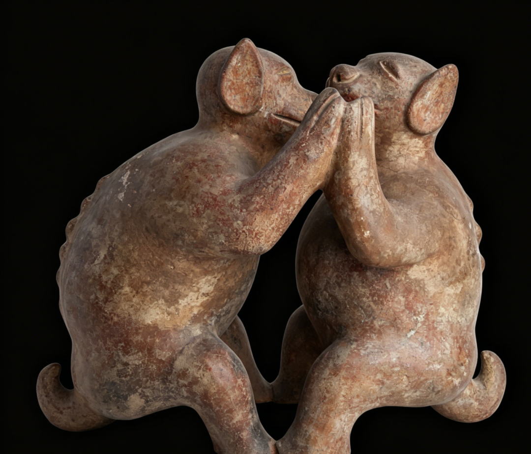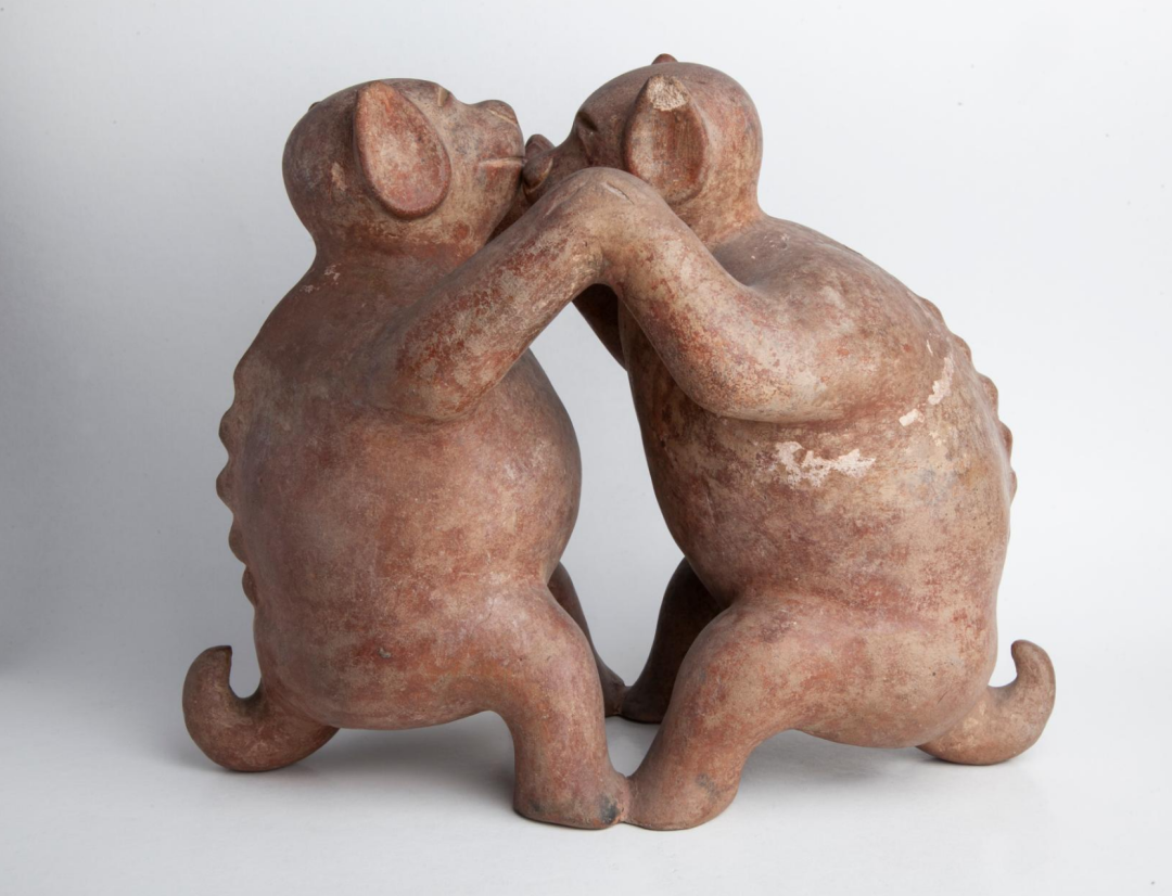 这对墨西哥西部科利马风格跳舞的狗陶像表现了一对如人一般直立,双手交握,面颊紧贴的动态形象,好似正在舞蹈。在科利马文化中,该形象通常成对出现,分别为一只较年长的狗和一只年轻的狗。跳舞的过程中,年老的狗会把自己的知识和智慧轻声细语地悄悄告诉年轻的小狗,象征着传承。无论是直立跳舞的行为还是代际传递的文化表现,这个拟人化的动物雕像说明动物在古代美洲地区有着和人类一样的性格与智慧。人与动物之间存在更为平等、紧密共生的关系。