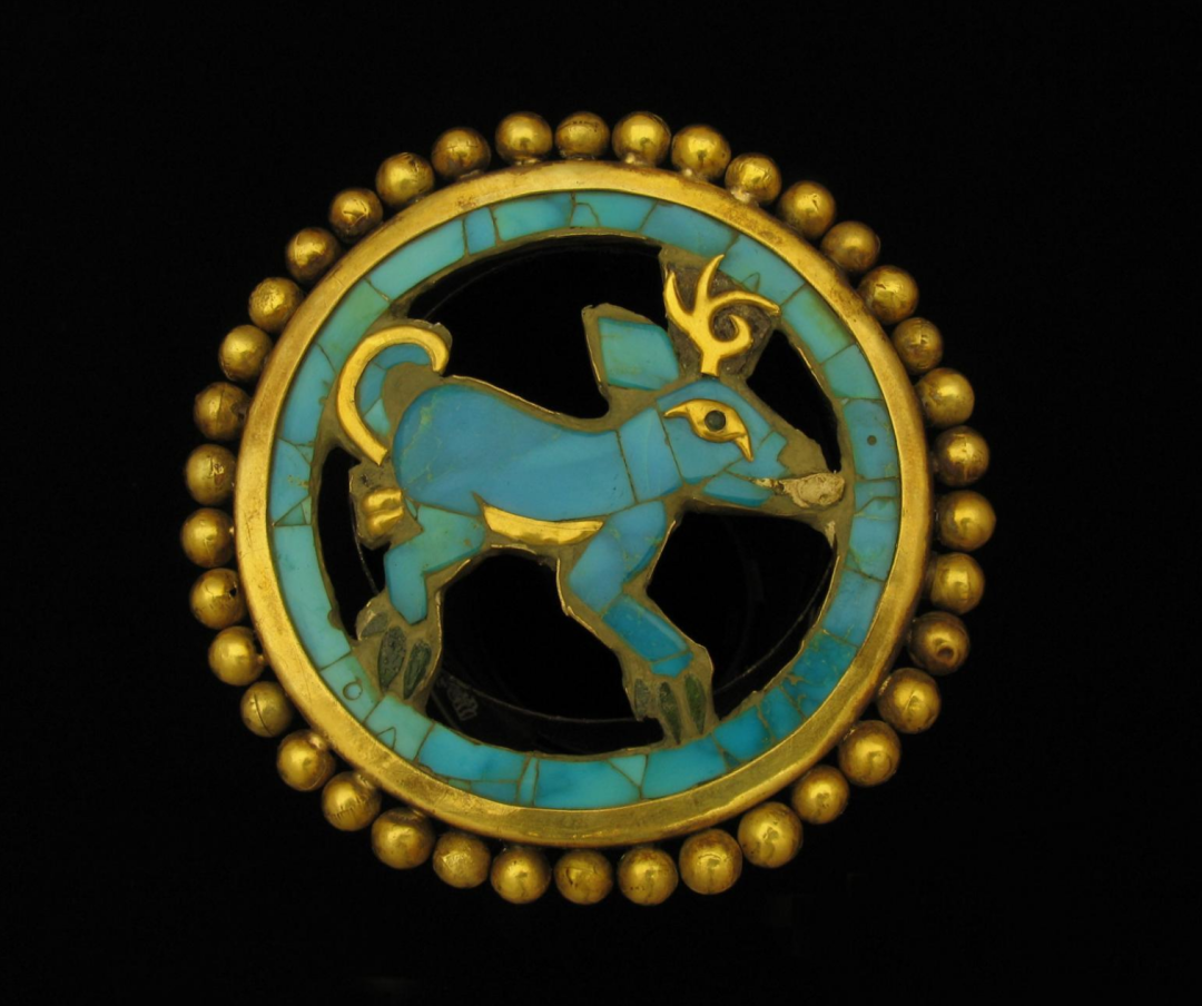 这件圆形耳饰,中央使用松石以马赛克形式拼贴出一只侧身奔跑的鹿,再以金丝勾勒轮廓、青金石点缀眼睛和蹄子。耳饰外缘金箔包边并环绕38颗金珠。鹿是莫切文化甚至整个北部沿海地区最重要的动物之一,有写实和人神同形两种表现方式。莫切工匠时常表现鹿在奔跑中喘气时总是伸出舌头的特征。这只鹿正是表现出伸舌头的动作。另外,从鹿角方向和鹿尾翘起的姿态,猜测这可能表现的是美洲白尾鹿。这种鹿生活在从北美至南美北部的大片区域,尾巴下方为白色,奔跑时翘起。