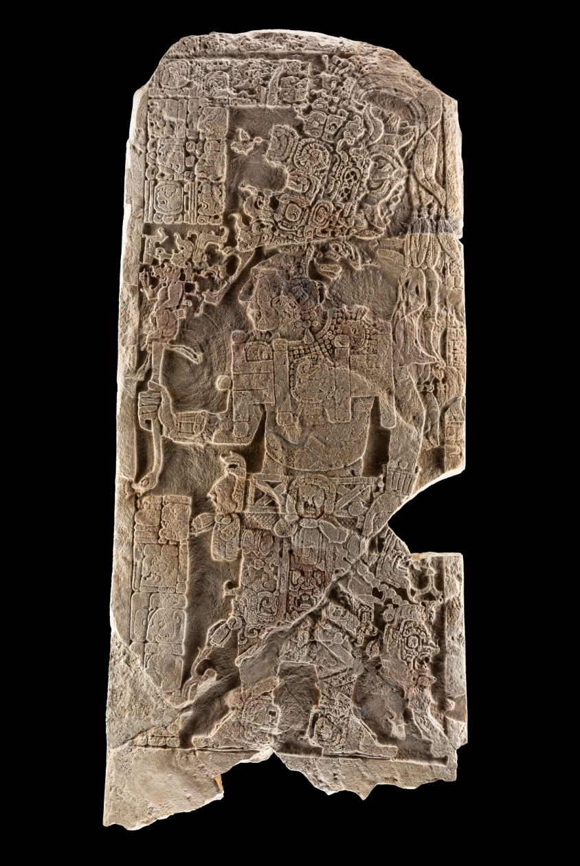 这件大型建筑构件出土自玛雅地区的城邦潘哈雷(Panhalé),它描绘了一位玛雅统治者的全身像,他侧身站立,头戴由玉和凤尾绿咬鹃羽毛做成的巨大头饰,象征与天神伊察姆纳的联系。此外,这位统治者手持权杖,杖顶站立着克阿维尔神,也是王权的象征。统治者腰部可见两个人脸,象征着他在战争中斩杀的敌人的头颅。在此构件的左上与坐下均刻有玛雅文字,其内容记载了潘哈雷于公元770年归属于另一城邦波莫纳(Pomona)这一历史事件。