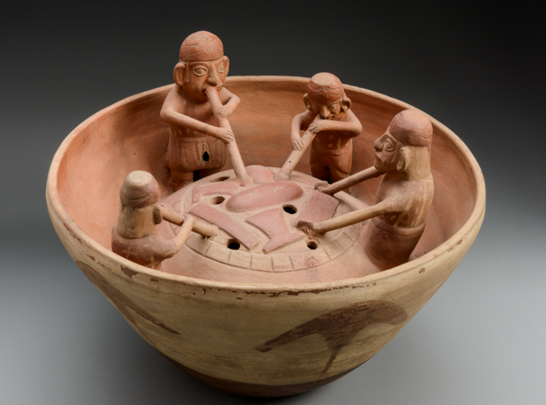 这件陶器呈碗状,表现了4位金匠冶炼的场景。其中3人围着半球形泥砖炼炉,使用长管向里面吹气,增加空气的流通来提高炉内温度。炉顶中央有凹槽,其上放置着7件片状金属器物,另1人在处理一件金属片。这件陶器的发现具有十分重要意义,通过它我们可以了解莫切冶炼的真实情景。这种小型炼炉在北部沿海地区在之后的文化中得到传承和发扬。
