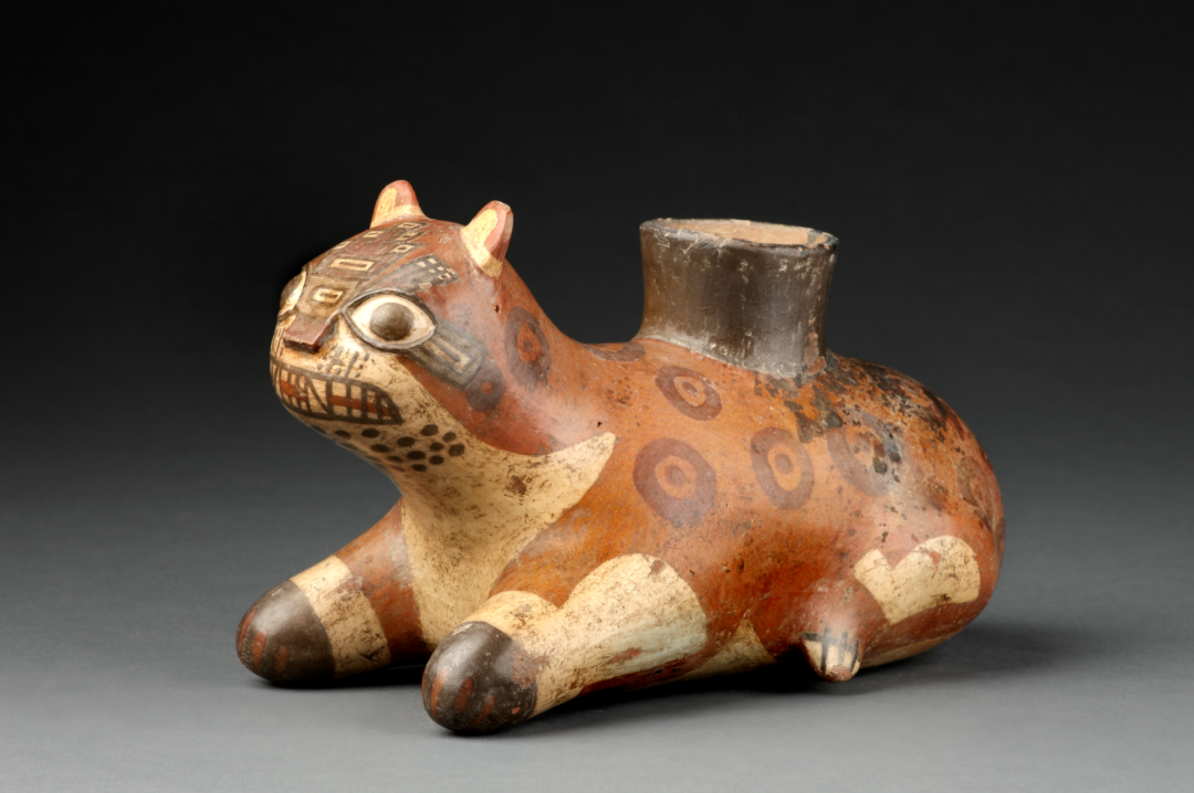 这件陶罐生动塑造了一只呈卧姿的猫科动物,其獠牙外露,背部和头部饰有同心圆纹样,推测可能为美洲豹。前爪以深色颜料勾勒,后肢则刻画出利爪形态,额头上还饰有象征羽毛的阶梯状纹饰。器身上的绘画手法,可能受到南部沿海纳斯卡文化的影响,说明瓦里文化在发展过程中,对其他文化特征的吸收和创新。