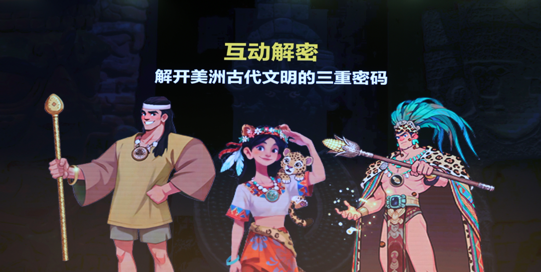 最具特色的当属“解开美洲古代文明的三重密码”实景沉浸式解密活动。观众佩戴NFC手环、权杖等道具,在展厅内外,线上线下,陪伴少年库西完成加冕、帮助玛雅王重建秩序,从“看展人”变身为“文明守护者”,通过互动解密活动沉浸式感受和理解美洲古代文明。