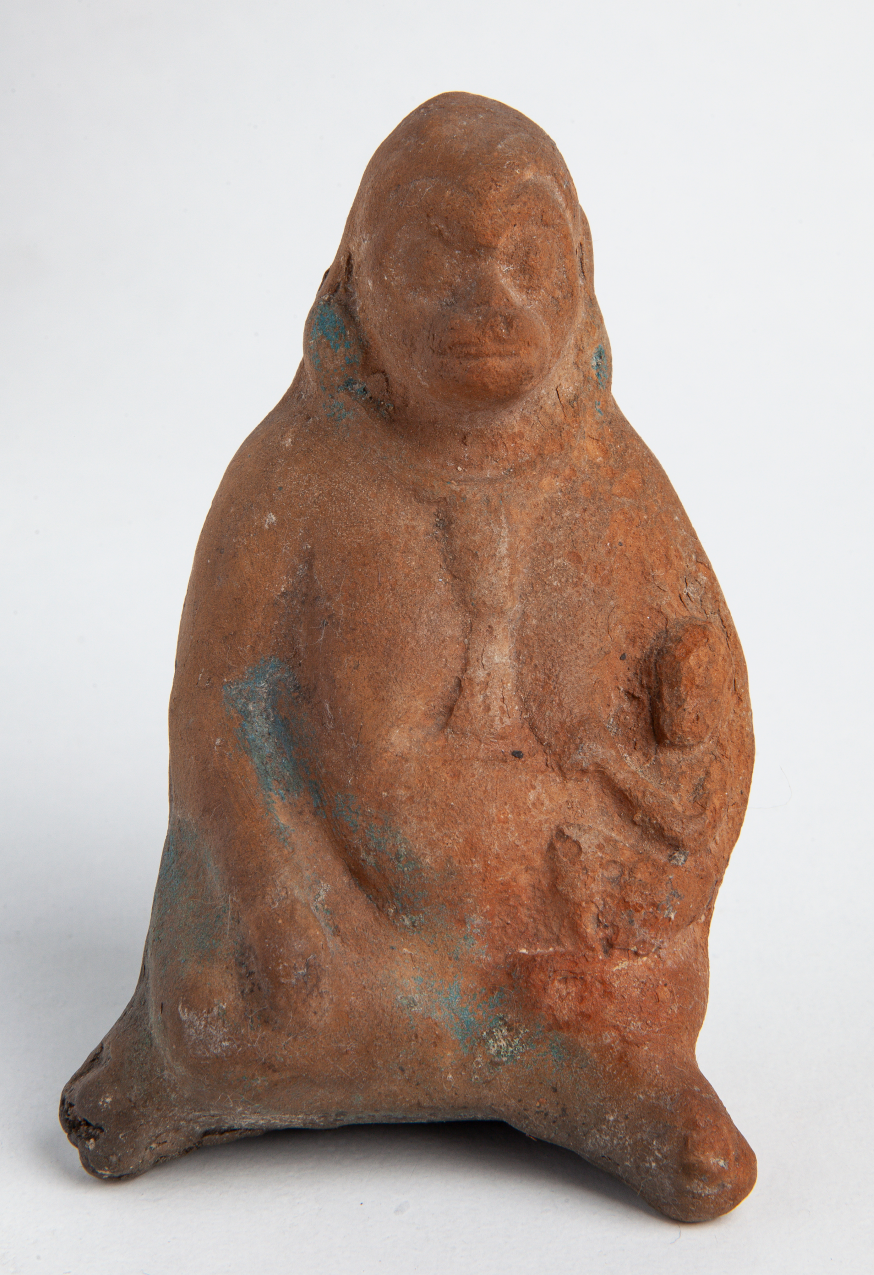 这件拟人化陶像表现的是玛雅小造像中常见的一个母题——“猴祖母”形象(Monkey Grandma),一只年老的雌性蜘蛛猴乳房明显下垂,腿上抱着一个人类或猴子婴儿。“猴祖母”题材可能与玛雅的市集妇女相关,妇女商贩常常需要离家数小时甚至数日到达市集,因此把孩子抱在腿上则成为了必需且有代表性的形象。
