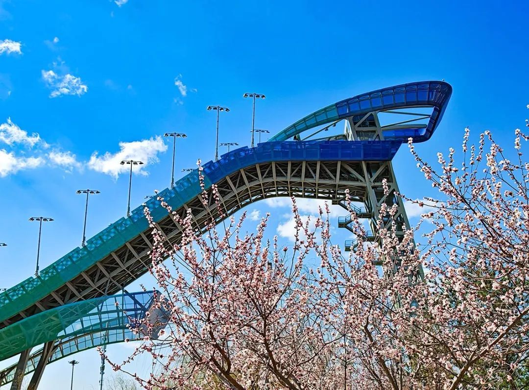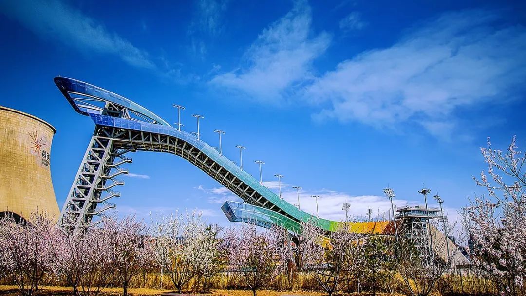 桃花盛放如云锦,随手一拍就是工业风大片!首钢滑雪大跳台与桃树相映成趣,适合拍摄复古感春日图。