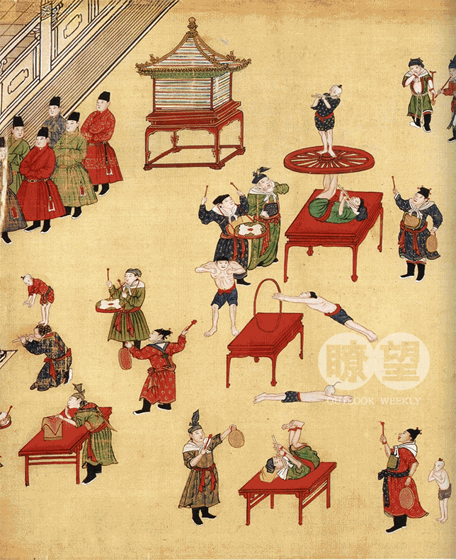 一位躺在桌上的男子单脚撑起细杆,光头童子一手抓杆,一手摇旗呐喊,而撑杆的男子却悠闲地吹起了笛子,一副艺高人胆大的模样。旁边助兴的乐队,敲锣打鼓,呐喊助威,好不热闹。