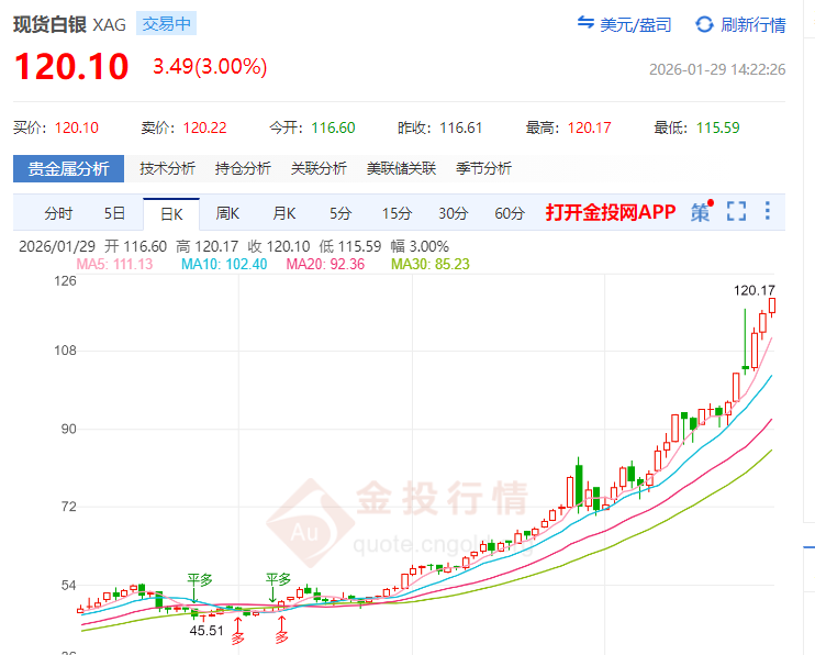 1月29日上午,现货白银价格最高为119.34美元/盎司,与年初时71.27美元/盎司相比,涨幅接近70%。