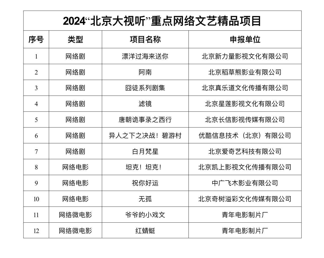 为深入学习贯彻习近平文化思想,持续加强北京网络视听精品创作生产,发挥精品示范引领作用,北京市广播电视局深化“北京大视听”文艺精品创作机制,持续发掘新题材、新故事、新表达,推出2024“北京大视听”重点网络文艺精品项目。片单涵盖了网络剧、网络电影、网络微短剧、“短剧游北京”、网络动画片、网络文化节目、网络综艺节目、网络纪录片等八大类别,共计60部优秀作品,以多元视角生动讲好中国故事、北京故事。