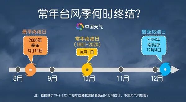 那么,今年台风季是否会就此结束?周丽贤表示,目前台风季结束尚未有定论,常年最后一个台风登陆我国的平均时间为10月1日,但往年11月至12月也出现过台风生成并登陆我国的情况,最晚的是2004年12月4日登陆我国的台风“南玛都”。