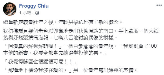 而绰号“呱吉”的台北市议员邱威杰则开玩笑说,“继重新定义青壮年之后,年轻男孩纸也有了新的概念”。