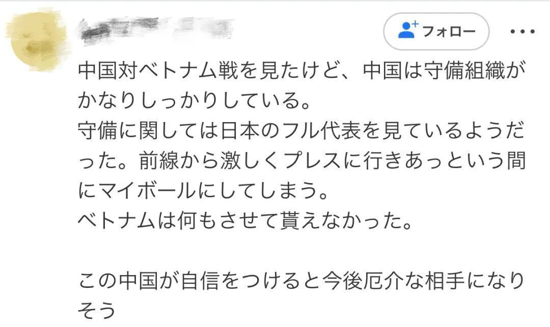 “我看了中国对阵越南的比赛,中国队的防守组织相当稳固。单看防守的话,水平已经堪比日本队了。他们从前场就开始积极逼抢,能很快把球权夺回来。越南队完全没能组织起有效的进攻。如果这支中国队建立起信心,未来很可能会成为一个难缠的对手。”