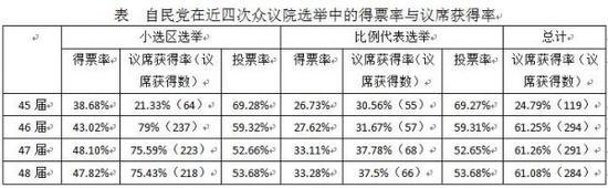 近三次众议院选举中,自民党连续取得胜利,分别赢得294、291、284个议席。由于小选区选举制度的实行,自民党的议席获得率明显高于其得票率。该选举制度下,选举结果并不能切实反映选民意见。尤其是在中小型政党相互之间难以凝聚联合的情况下,大型政党更容易以较低得票率获取较多议席。可见,自民党作为传统大型政党在众议院选举制度方面占据的优势,在一定程度上促成了安倍政权的长期运作。