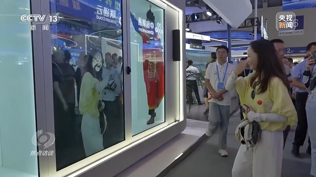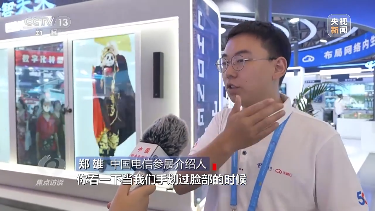 中国电信参展介绍人 郑雄:大家只要站在摄像头前面,系统就会识别到人脸,当人脸发生改变的时候,它就会切换下一张脸谱。当我们手划过脸部的时候,人脸消失之后,系统就会检测到,自动切换下一张脸谱。