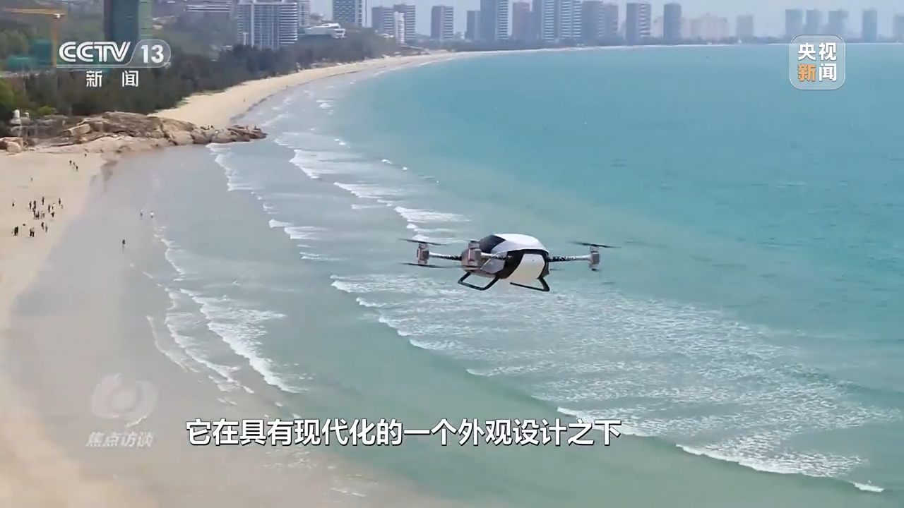 某汽车企业参展介绍人 黄佳明:它在具有现代化外观设计之下,又加持了非常多的智能科技,比如智能驾驶、精确的雷达测距以及自动避障功能。同时,它有一个全机的自动降落伞,如果遇到紧急情况可以保证安全。它现在主要运用于园区的展示或者巡逻,或者观光旅游,还没有进行大规模量产。