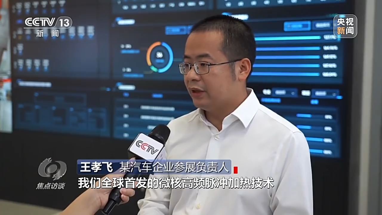 某汽车企业参展负责人 王孝飞:我们的研发团队用了5年时间,研发出了七合一超集电驱,从而让系统的综合效率最高达到了95%的行业领先水平。我们全球首发的微核高频脉冲加热技术,能够在-30℃的低温环境下对电池快速加热,极大缓解新能源汽车在低温冬季续航的问题。