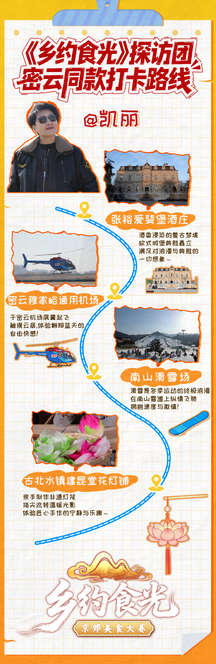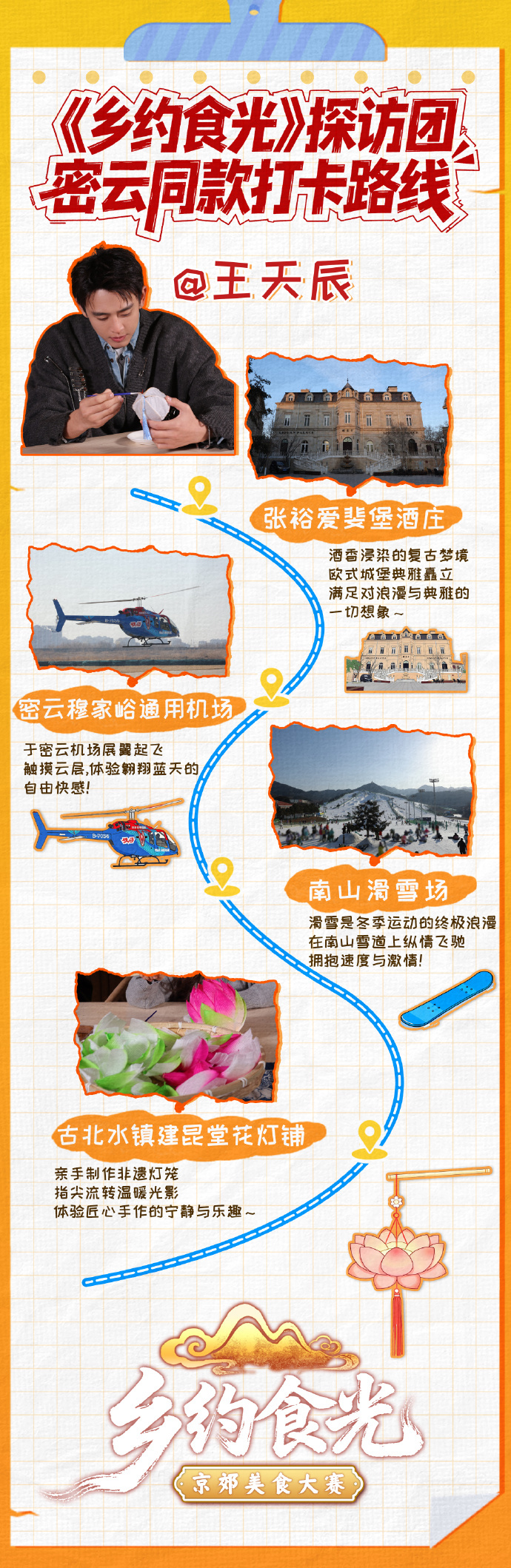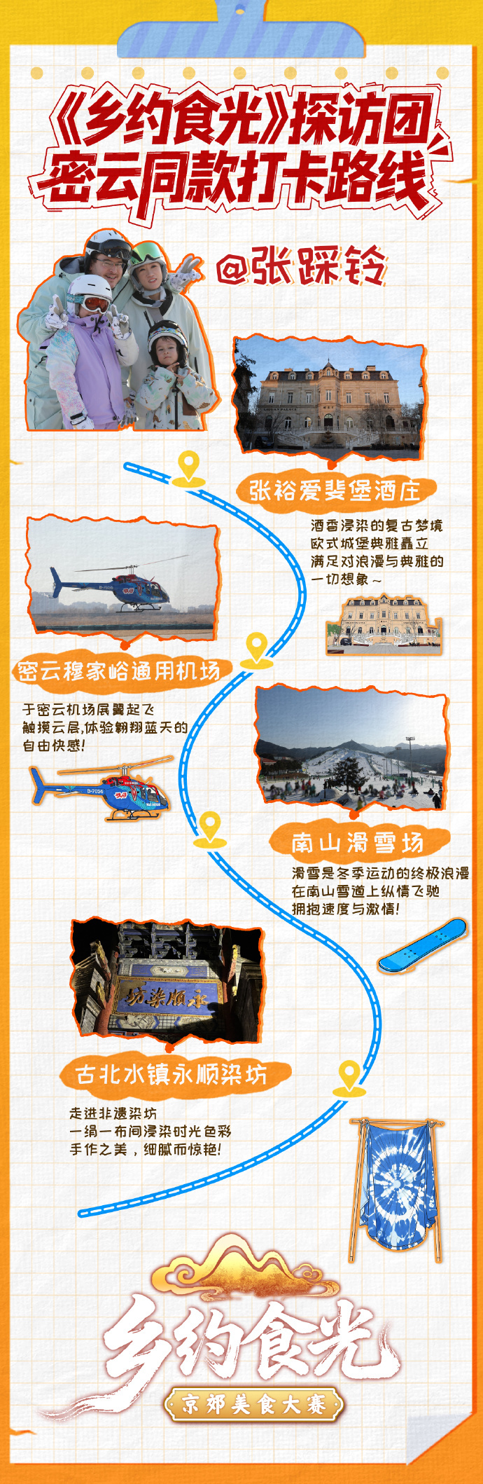 《乡约食光》密云打卡团上线!乡约好吃团成员王天辰、张踩铃、张凯丽解锁张裕爱斐堡酒庄的欧式浪漫,打卡密云穆家峪通用机场的天际视角,畅享南山滑雪场的雪上飞驰,体验古北水镇永顺染坊和建昆堂花灯铺的手作乐趣~ 这趟京郊快乐直接溢出屏幕!