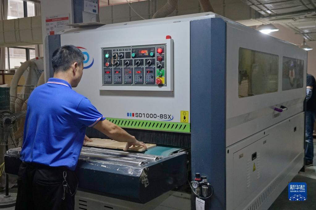 6月15日,在浙江智木玩具的生产车间,工人把木板放入自动打磨抛光机。新华社记者 林光耀 摄