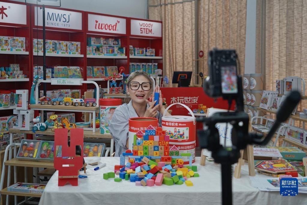 6月15日,浙江和信玩具集团主播在直播带货。新华社记者 林光耀 摄