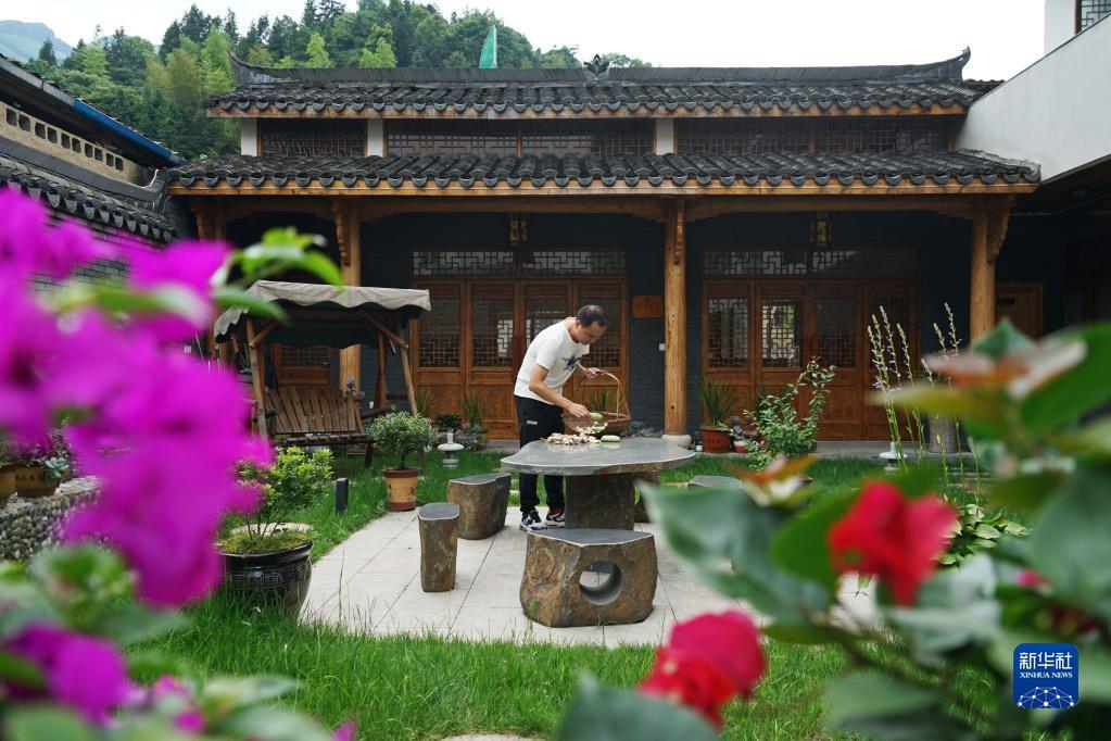 6月14日,民宿业主季发东在民宿院中晾晒大蒜。新华社记者 林光耀 摄