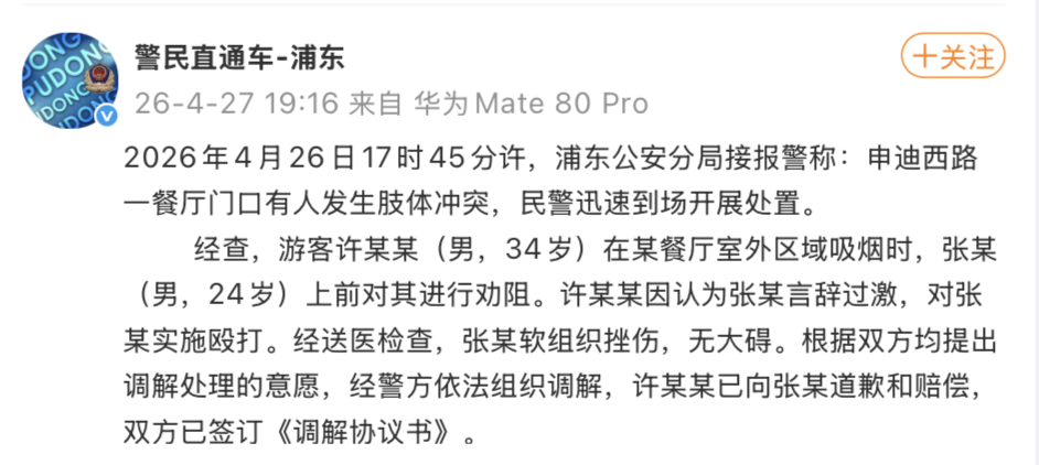 4月26日17时45分许,浦东公安分局接报警称:申迪西路一餐厅门口有人发生肢体冲突,民警迅速到场开展处置。