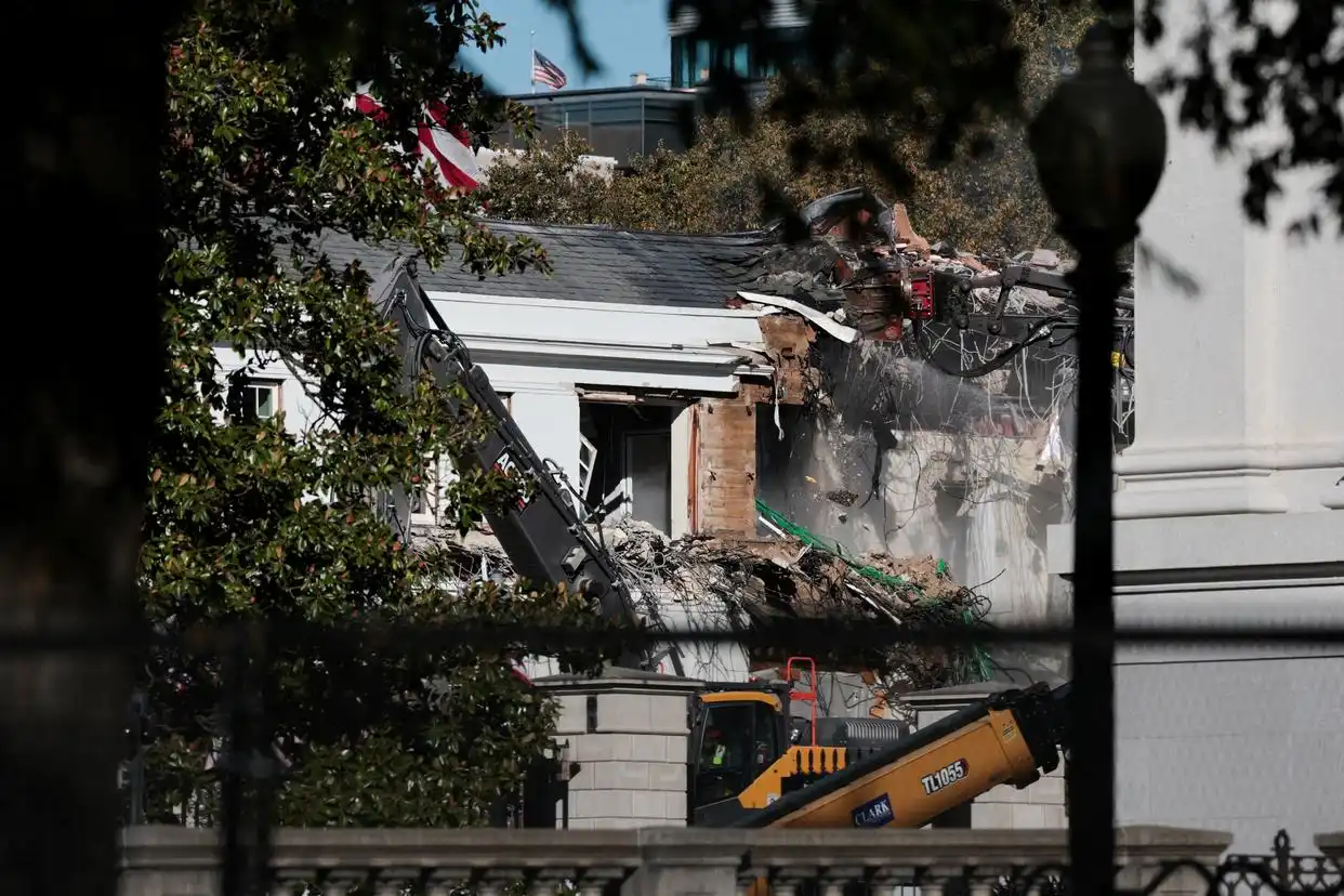 据美国媒体报道,三天前,美国白宫里,突然出现了施工队,开始拆除白宫东翼的建筑,从视频画面能看到,窗户也砸碎了,墙面也拆了,里面钢筋都露出来了,现场还有大型机器在作业,甚至水管喷水抑制扬尘,活脱就是个拆迁现场。