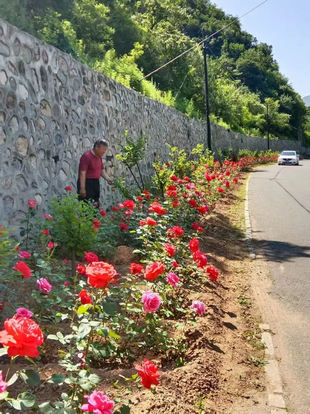 曾经,孙胡沟村的主干路是破旧的老柏油路,晴天尘土飞、雨天坑洼滑。尹春燕书记多方筹集资金,把柏油路铺到每家每户门前,补上排水沟,种下5000棵月季、150棵榆叶梅。从村口一进来,道路宽阔,花草摇曳,山道上一簇簇月季开得正好。