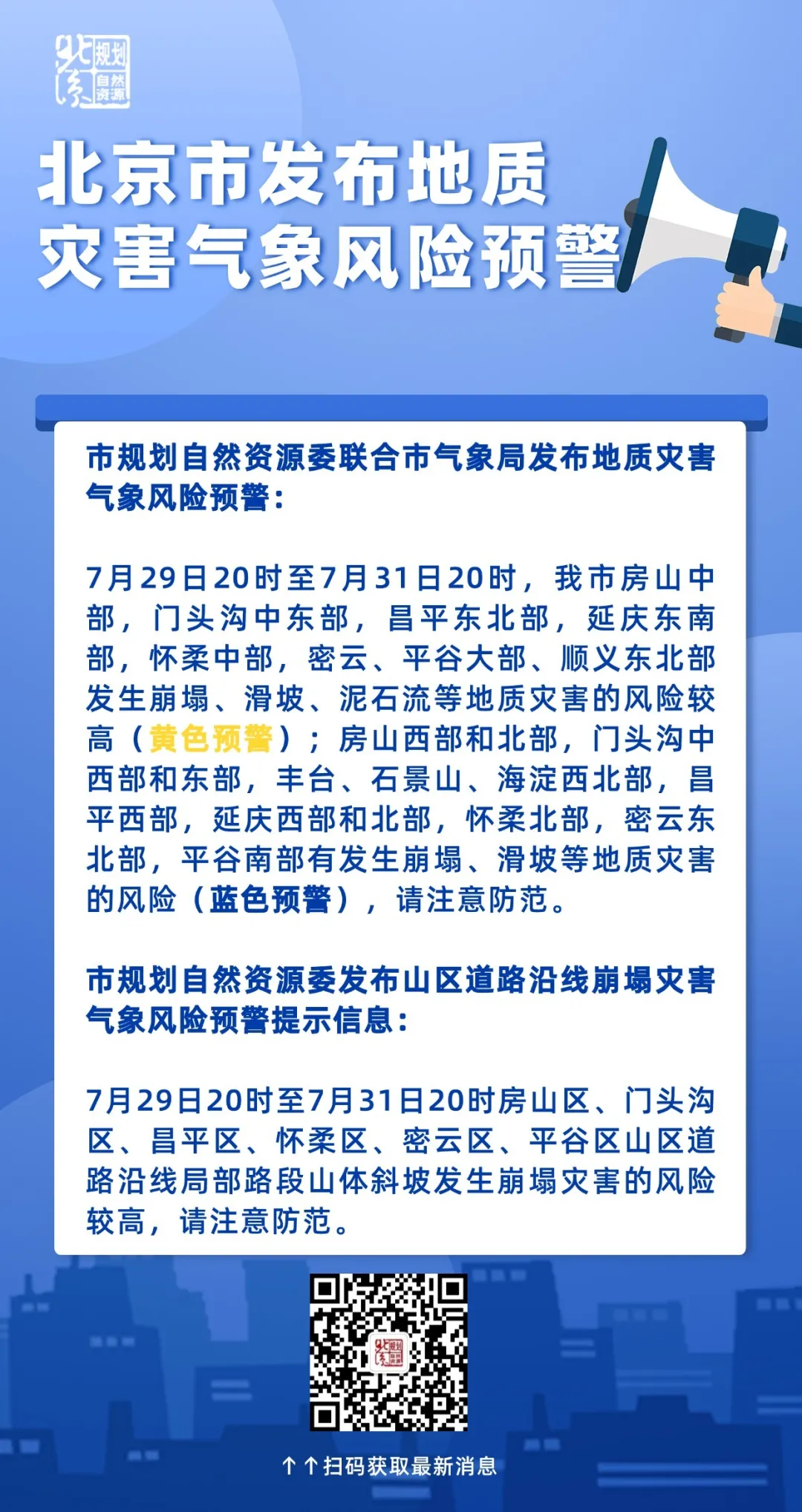 据“北京规划自然资源”官微消息,7月29日,北京市发布地质灾害气象风险预警。