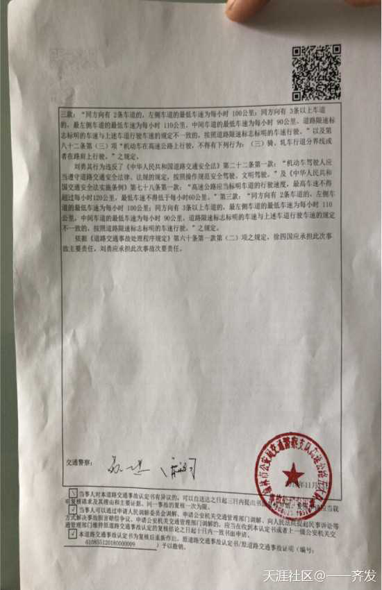 网帖称,包茂高速同方向有超车道、行车道和应急车道,徐四国驾车在行车道行驶,摩托车在行车道追尾,因追尾造成车辆瞬间失控,车被撞停时因撞击原因才造成现场车轮压线的静止状态,所以刘某理应负全责。