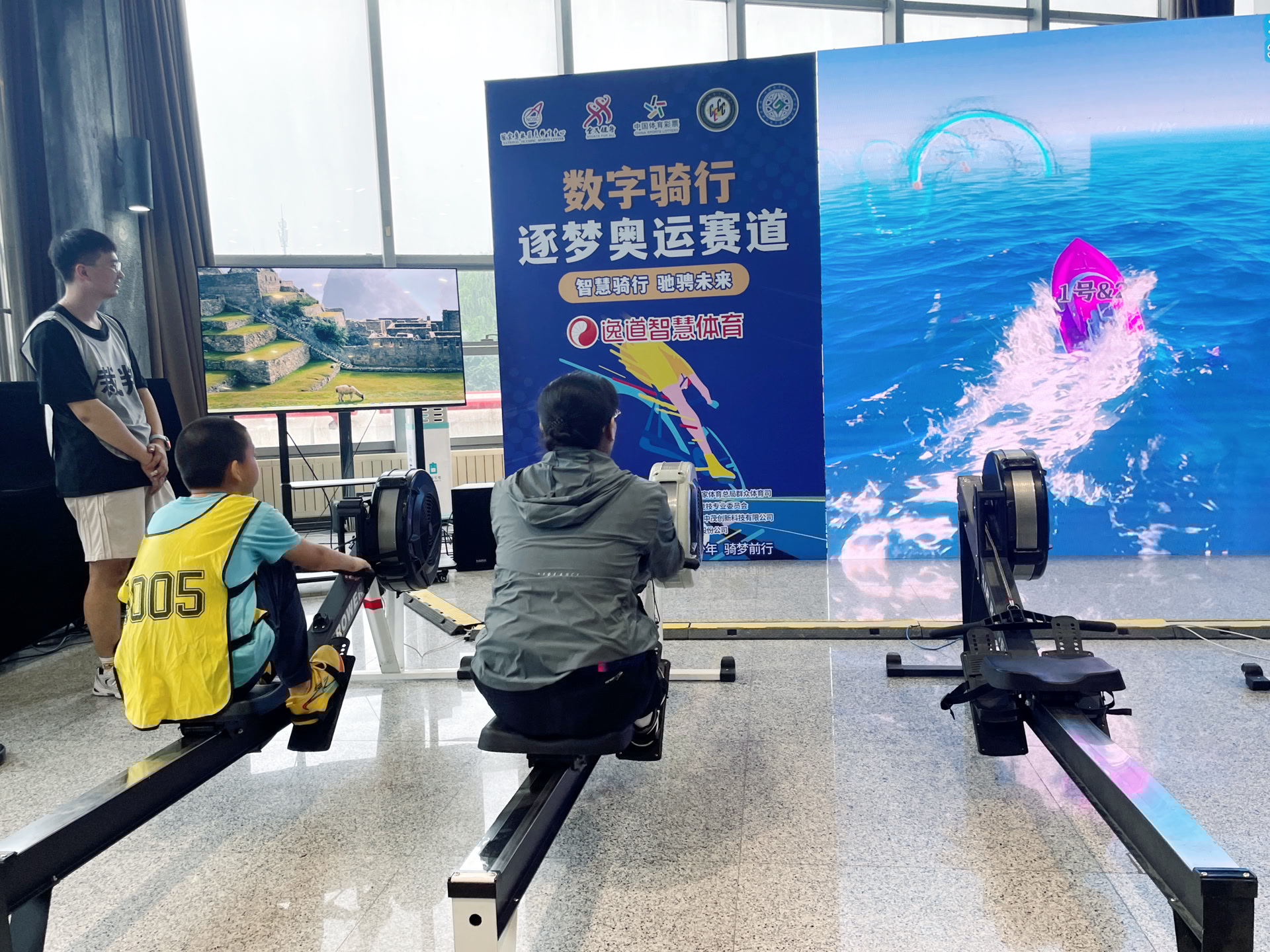 本届系列活动期间,“国家奥体杯”全国数字骑行、数字赛艇大赛的线下赛场落户奥体中心。选手们坐在设备上,盯着屏幕奋力划桨、快速蹬踏,与远隔万里的“线上”对手隔空竞技,玩儿得不亦乐乎。