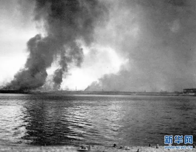 1950年10月初,侵略军悍然越过三八线,并把战火烧到中国边境。图为安东市(今辽宁省丹东市)对岸朝鲜新义州在浓烟烈火中(新华网)